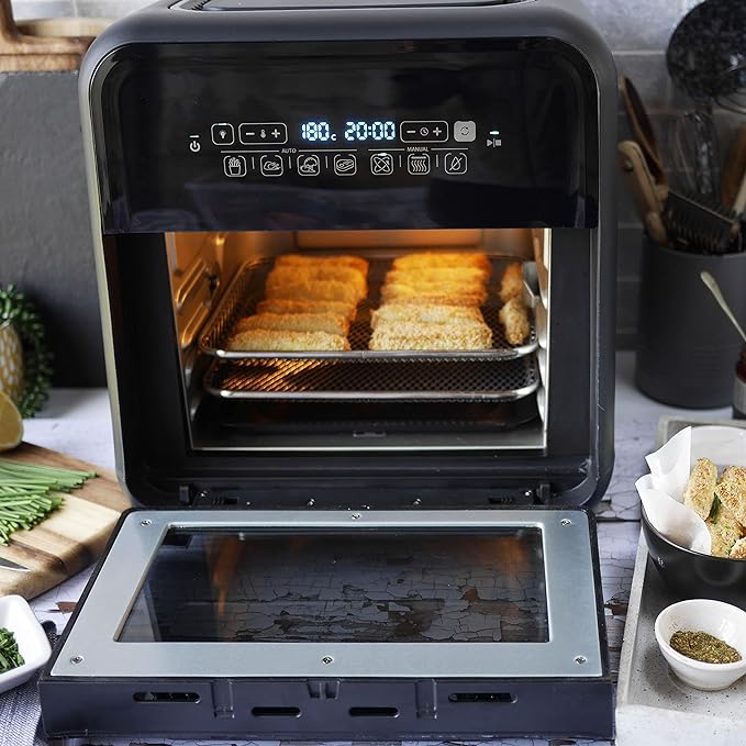 - Zubehör: Beinhaltet 3 Luftzirkulationsgitter, einen 3,2 L Drahtkorb, einen Drehspieß und einen Haltegriff, alle spülmaschinenfest für eine erleichterte Reinigung.